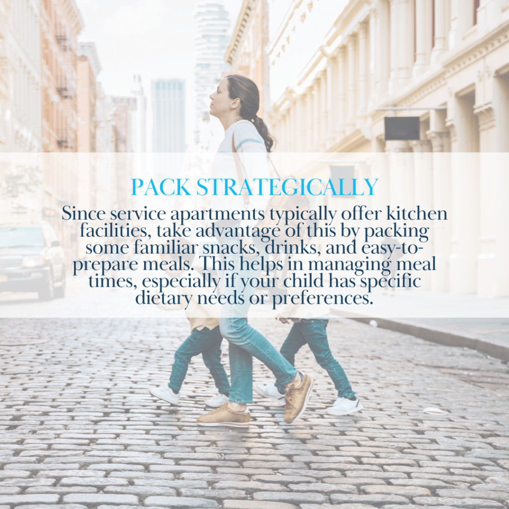 One of the benefits of staying in a service apartment is having access to a kitchen, which allows you to prepare meals and snacks just like at home. When packing, think beyond just clothes and toys. Bring along some of your children’s favorite snacks, easy-to-prepare meals, and any special dietary items they might need. Having these familiar foods on hand can help avoid unnecessary stress during meal times and keep everyone happy, especially if you’re dealing with picky eaters.